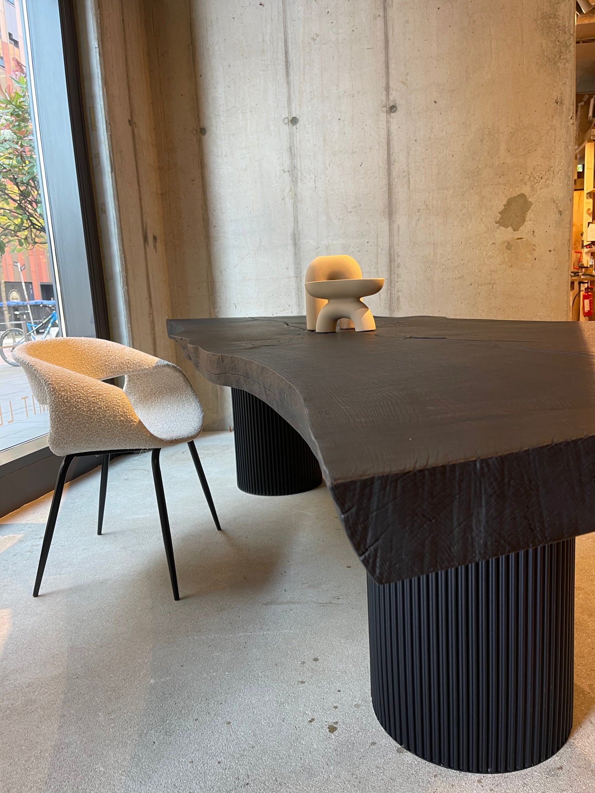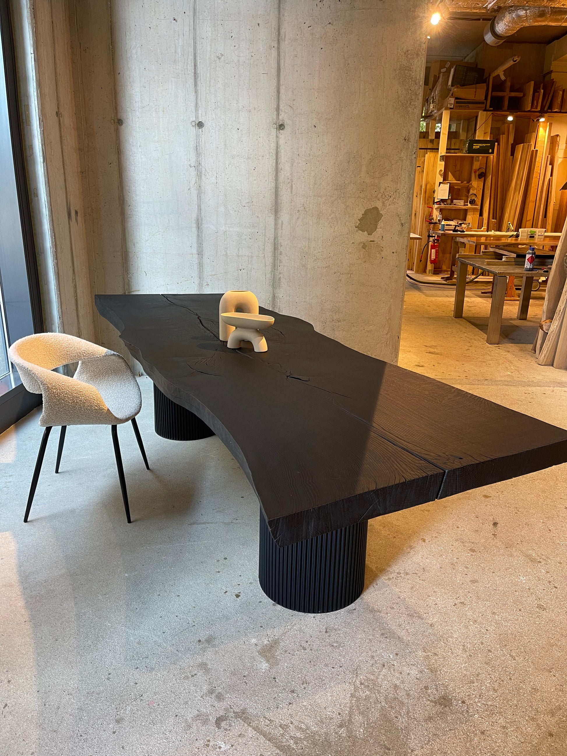 Dieser einzigartige schwarze Esstisch besteht aus einer großen Stammbohle aus Massivholz Eichenholz mit einer natürlichen Baumkante. Die Oberfläche wurde geköhlt, gebürstet und mit Hartwachsöl versiegelt, was dem Tisch eine markante und dennoch geschmeidige Textur verleiht. Der dunkle, schwarze Look macht diesen Tisch zu einem echten Statement in Ihrem Esszimmer.