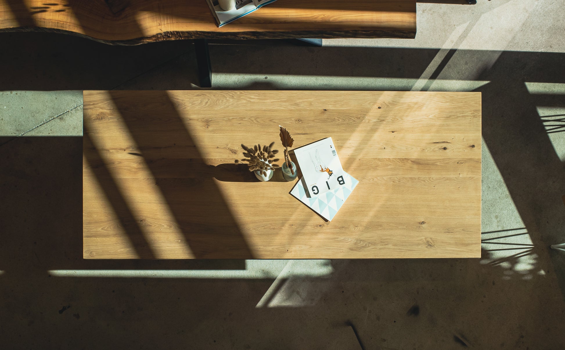 Vom Rohholz zum Designstück. Jeder Tisch trägt unsere Meistersignatur.