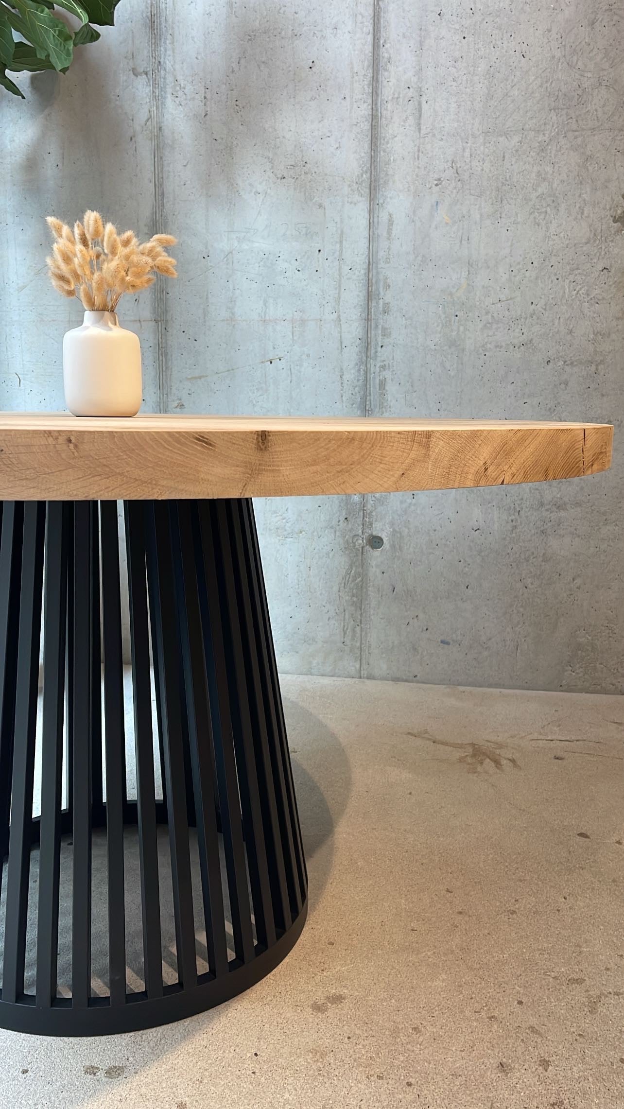 Dieser runde Massivholztisch kombiniert die Einzigartigkeit von historischem Eichenholz-Altholz mit einem modernen Mittelfuß aus Metall mit Lamellen in Schwarz. Der besondere Materialmix aus rustikalem Holz und industriellem Metall macht diesen Tisch zu einem außergewöhnlichen Blickfang in jedem Wohnraum.