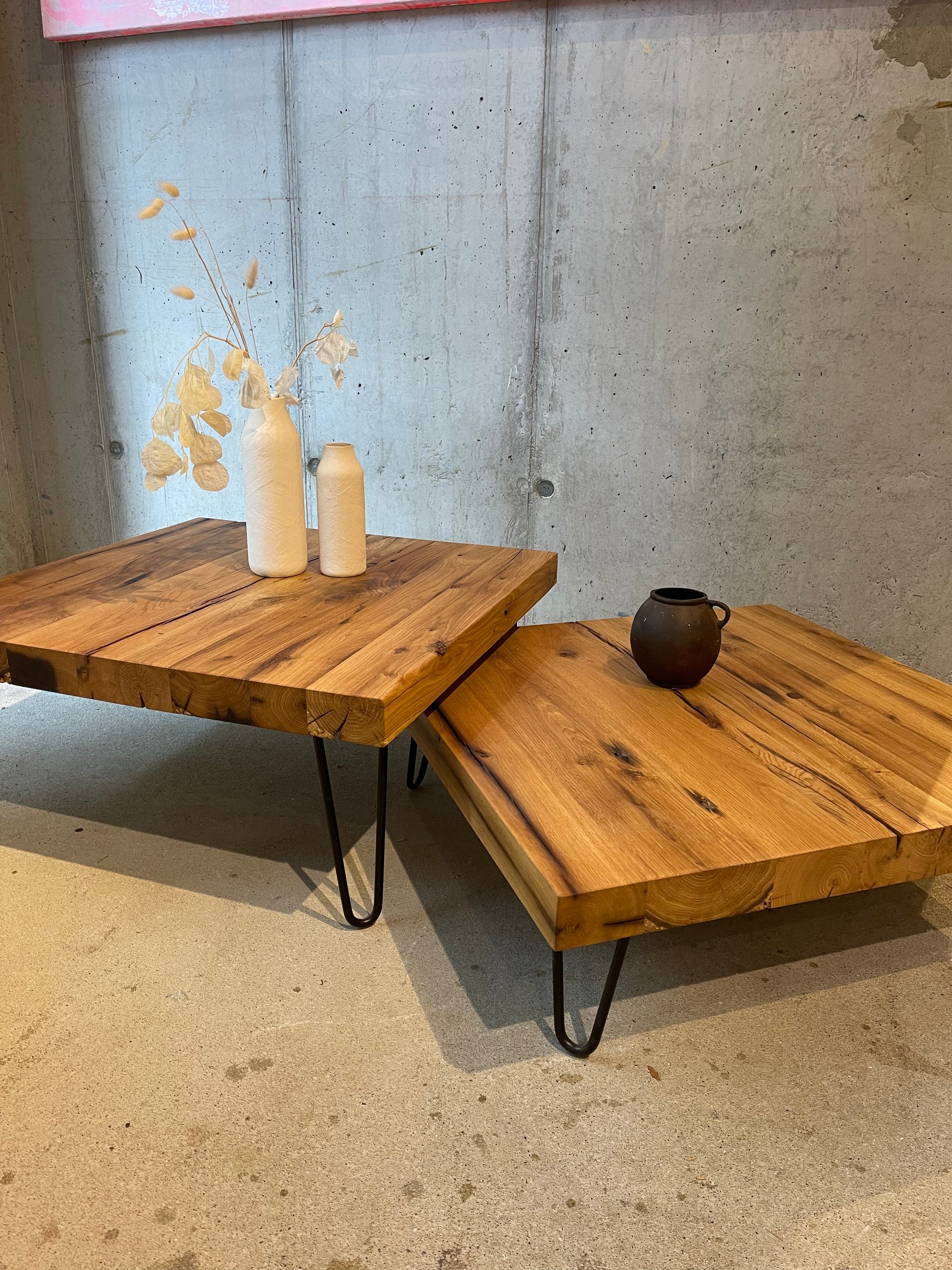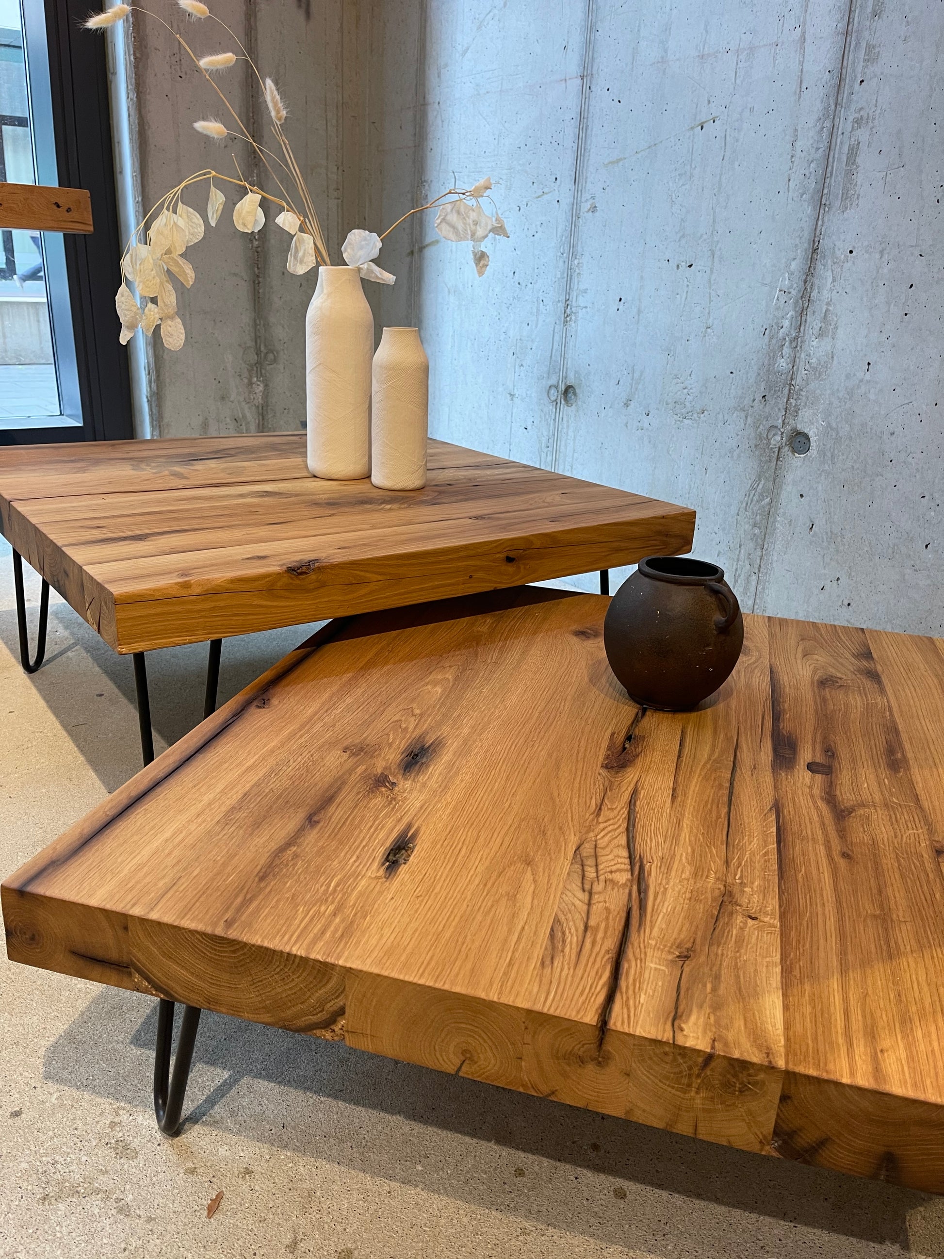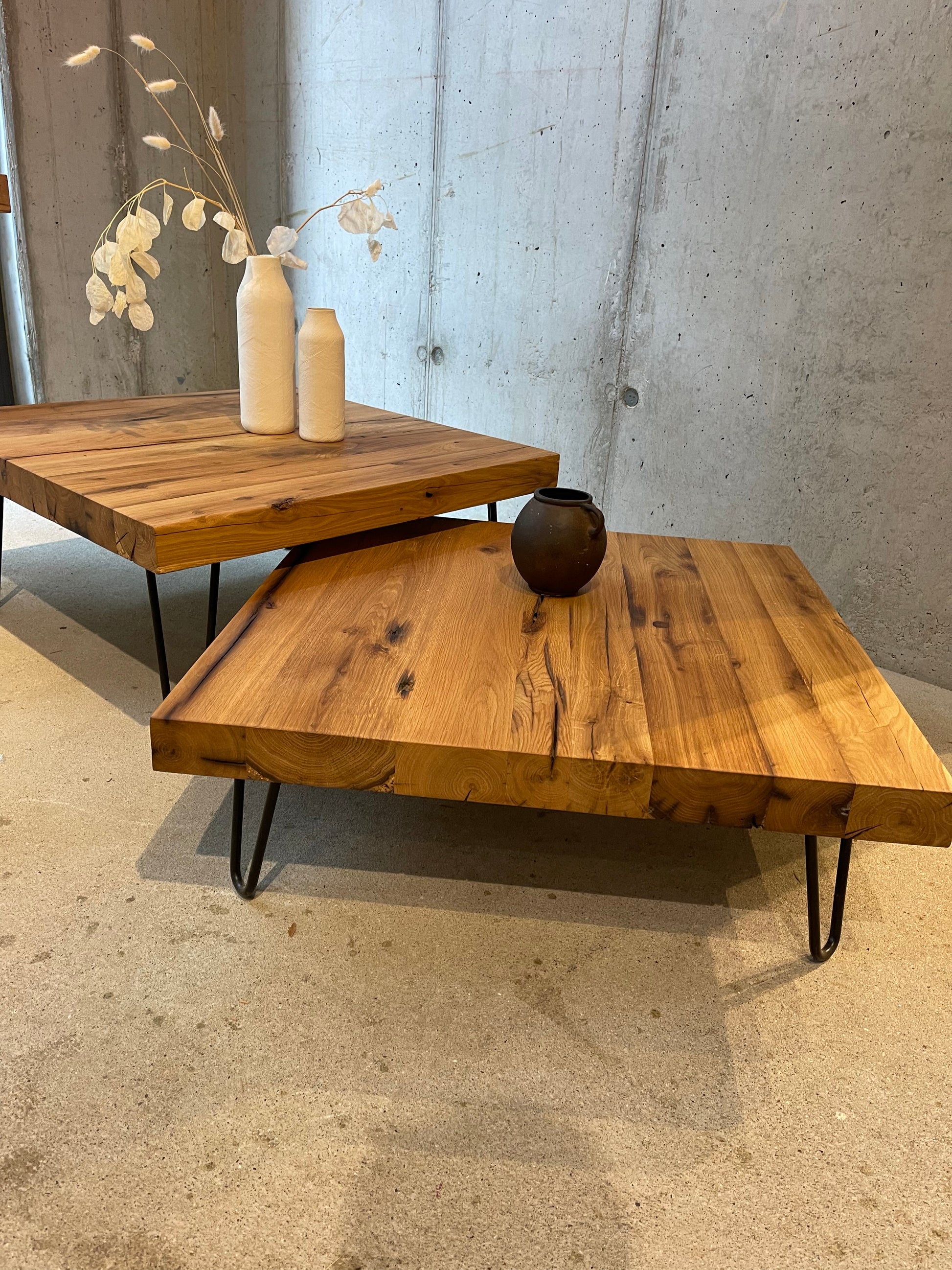 Hier zu sehen und aktuell vorrätig: Couchtische aus Massivholz im Maß 80x80cm gefertigt aus historischem Eichenholz-Altholz. Das Baumaterial alter Fachwerkhäuser ist hier zu einer charakterstarken und individuellen Tischplatte mit einer Plattenstärke von 7cm und klaren Linien gefertigt. Die Oberfläche ist mit einem Hartwachsöl final versiegelt und bietet somit perfektem Schutz gegenüber Flecken und Flüssigkeiten.